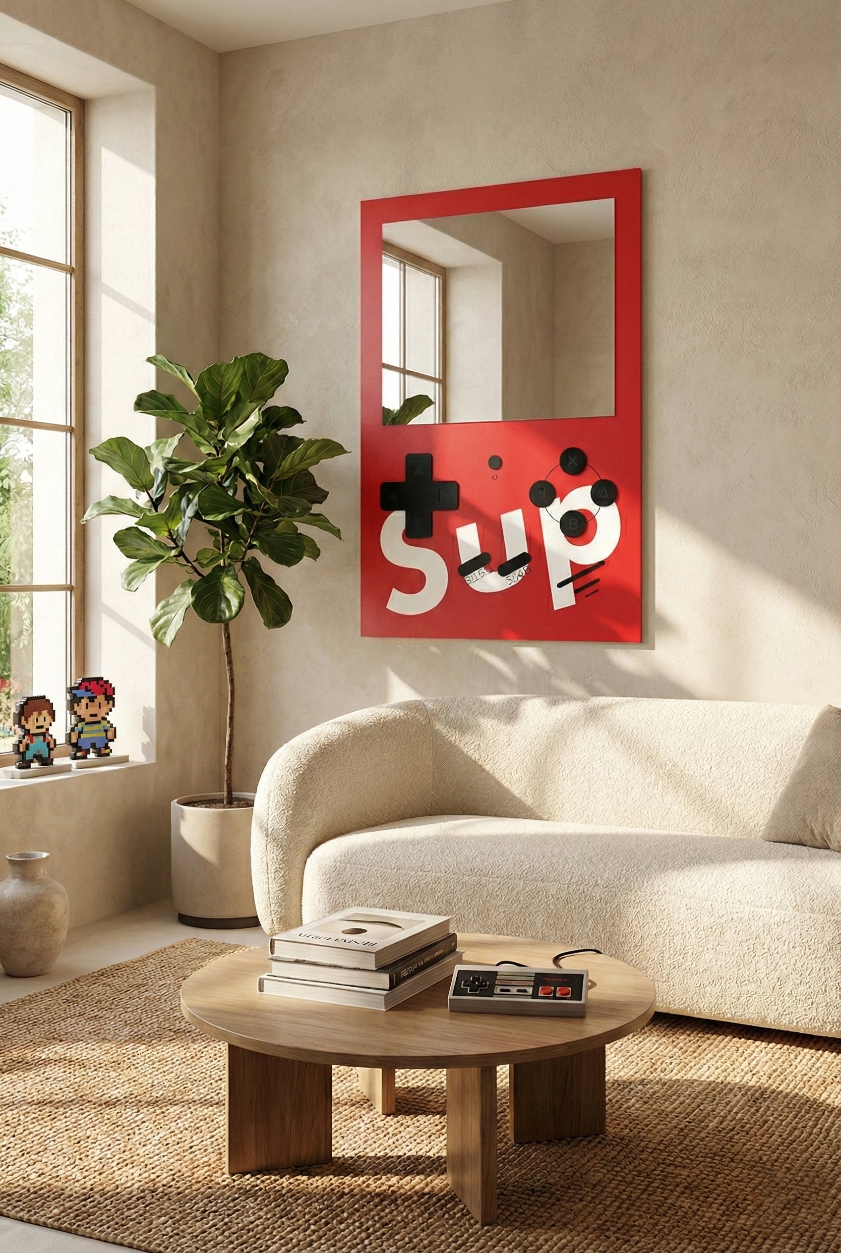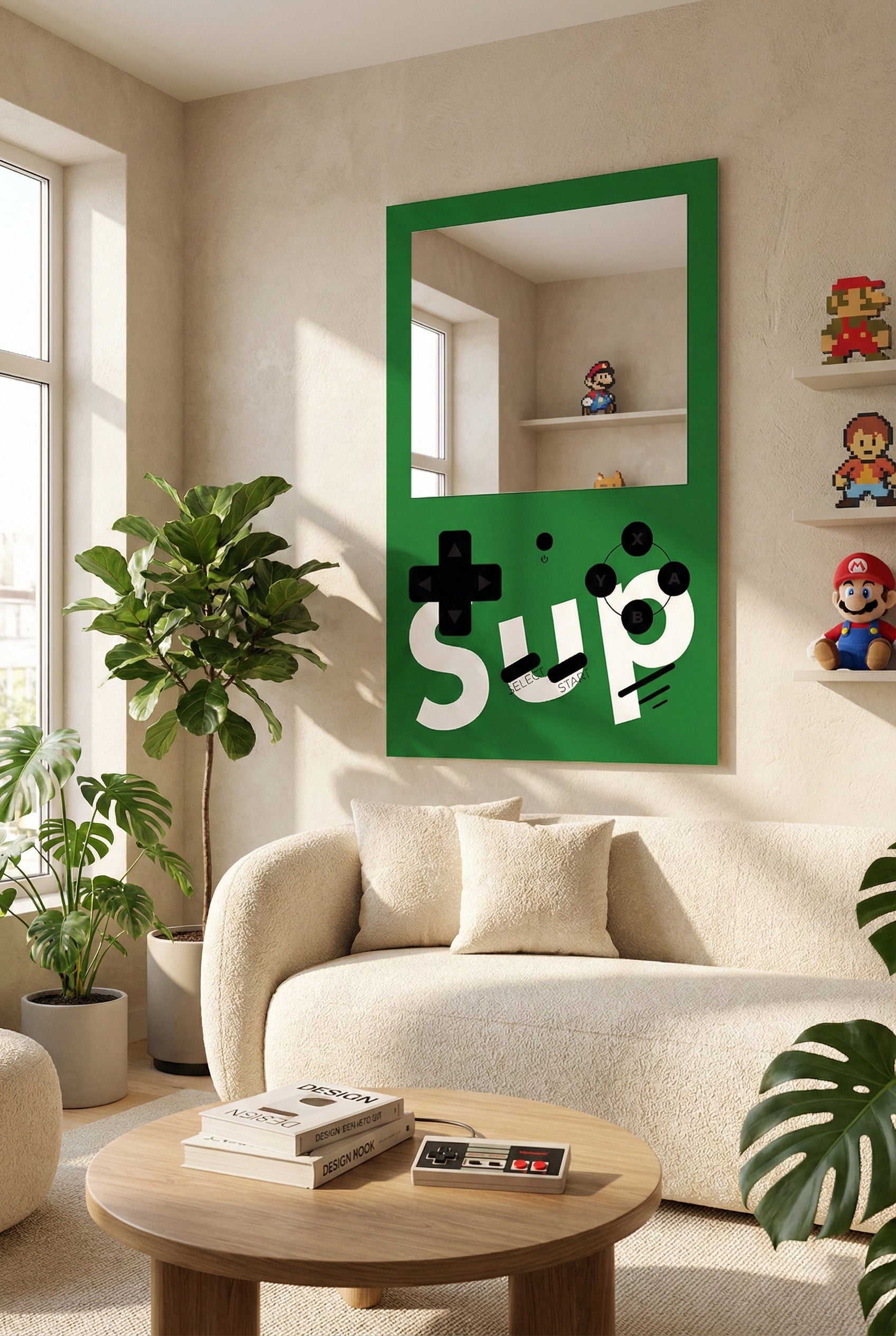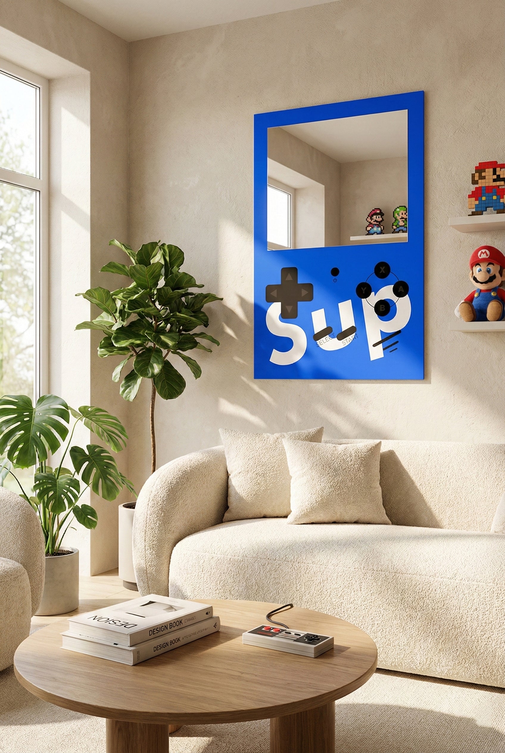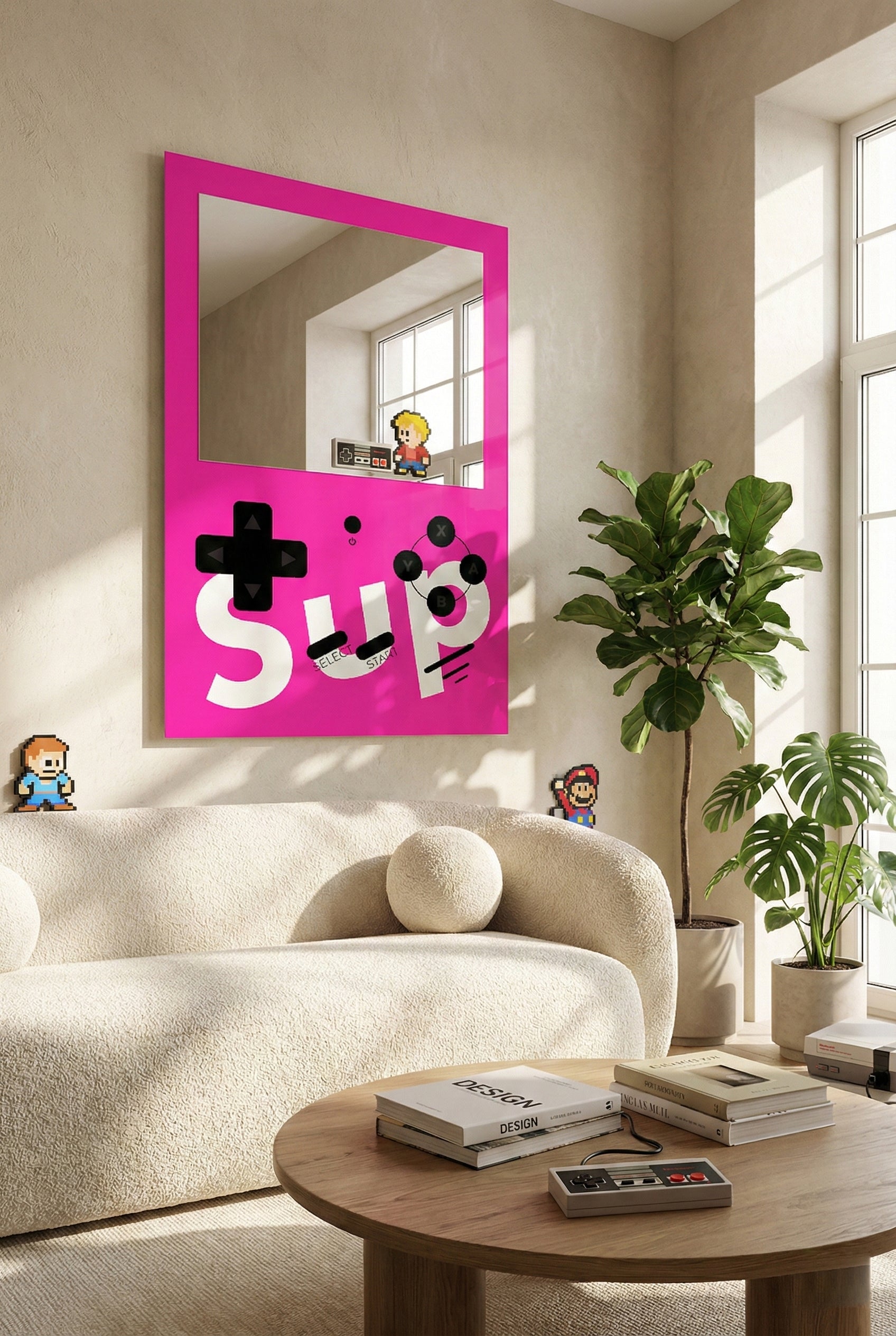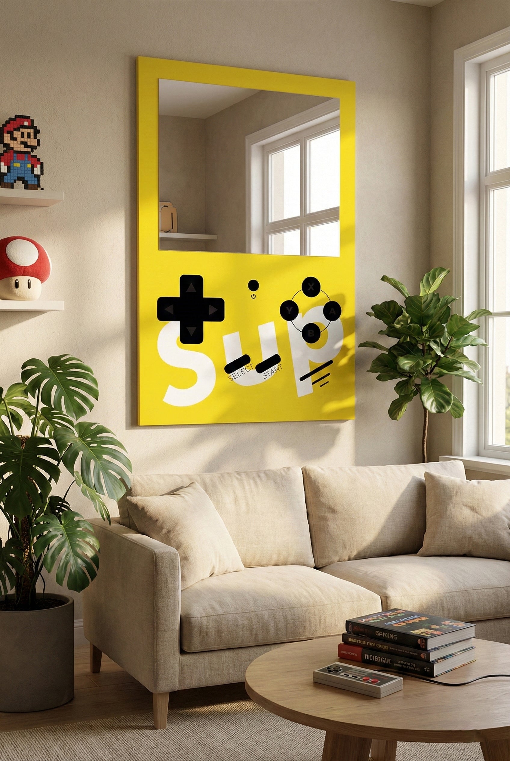 Retro oyun konsolu tasarımını modern ev dekorasyonu ile buluşturan bu özel tasarım ayna, hem nostalji severler hem de farklı tarz arayanlar için mükemmel bir duvar dekorudur. Sarı zemin üzerine yerleştirilmiş joystick ikonları, butonlar ve oyun estetiğini yansıtan grafik detaylar, ürünü benzersiz ve dikkat çekici hale getirir.